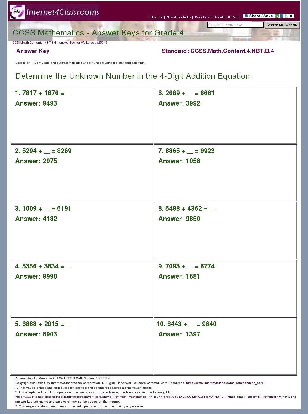 Is fourth grade math worksheets with answer key. 4th Grade Common Core Math Worksheets & Activities the key activities included in the 4th grade common core math worksheets (questions and answers) to increase the student's ability to apply mathematics in real world problems, conceptual understanding, procedural fluency, problem solving skills, critically evaluate the reasoning or prepare the students to learn 4th grade common core mathematics … 100 Free 4th Grade Math Worksheets with Answers The following collection gives you access to over 100 of the best free 4th-grade math worksheets for multiple topics and ability levels. All of the worksheets are available as printable pdf files that include complete answer keys. This collection is updated frequently and includes some of the best 4th grade math resources available anywhere online. 4th grade math worksheets with answer key math grade go 5th lesson homework answer chapter key unit answers practice 4th test sheet worksheet fifth iacf Prime and composite numbers 4th grade math worksheets. Addition digit regrouping math three worksheets fall grade practice extra need numbers ten teacherspayteachers. 5th grade go math unit 2 lesson 4 homework 4th grade math worksheets with answers pdf - mathskills4kids.com 4th grade math worksheets with answers pdf have been created to help kids have extra math practice in a most amusing way. Besides, we are looking forward to offer 4 th graders a firm foundation and fluency to basic math concepts as they engage in our stimulating free printable worksheets for fourth grade. In an effort to ensure this fluency, we have designed very practical and fun 4th grade math word problems worksheets pdf and much more exercises, so that kids can have an enjoyable time ...